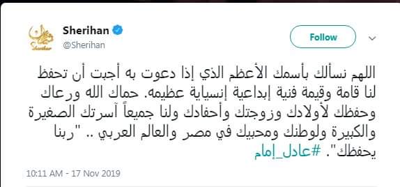 بعد انتشار شائعة جديدة عن تدهور الحالة الصحية للفنان المصري عادل إمام، وجهت الممثلة المصرية شريهان رسالة مؤثرة له، فكتبت:"اللهم نسألك باسمك الأعظم الذي إذا دعوت به أجبت أن تحفظ لنا قامة وقيمة فنية إبداعية إنسانية عظيمه. حماك الله ورعاك وحفظك لأولادك وزوجتك وأحفادك ولنا جميعاً آسرتك الصغيرة والكبيرة ولوطنك ومحبيك في مصر والعالم العربي .. "ربنا يحفظك".