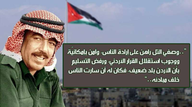 ثمانية وأربعون عاما مضت على رحيل الرمز الوطني الأردني، وصفي التل، الذي مازال حيّا في الوجدان الشعبيّ، تستحضره الذاكرة الجمعيّة، في كلّ محطّة أو منعطف أو مفترق طرق تواجهه الدولة الأردنيّة. منذ نشأة هذه الدولة وحتّى اليوم، لم يتمكّن أيّ رئيس وزراء أردني، من مجرّد الإقتراب من المنزلة التي اعتلاها وصفي، دون غيره، فلماذا؟