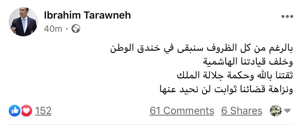 اكذ المهندس ابراهيم الطراونة انه "ورغم من كل الظروف سنبقى في خندق الوطن وخلف قيادتنا الهاشمية"، وذلك خلال منشور جديد نشره اليوم على صفحته الشخصية عبر موقع التواصل الاجتماعي الفيس بوك .
