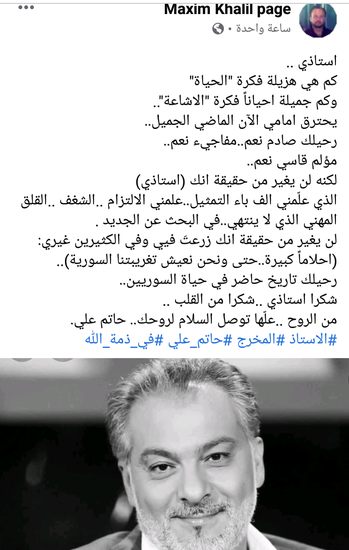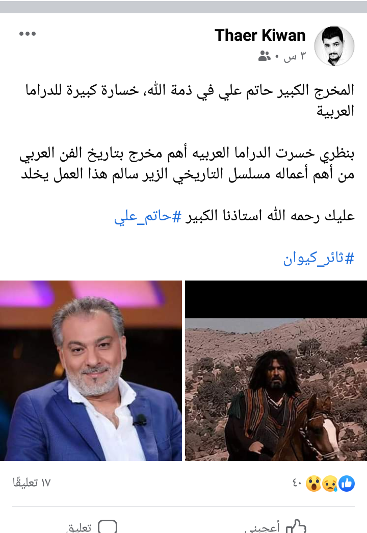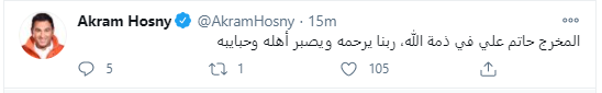 بينما كتب الفنان أكرم حسنى عبر حسابة على تويتر:"المخرج حاتم علي في ذمة الله، ربنا يرحمه ويصبر أهله وحبايبه".