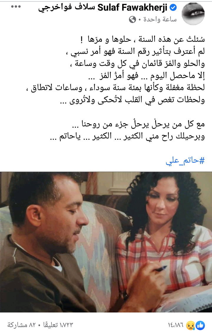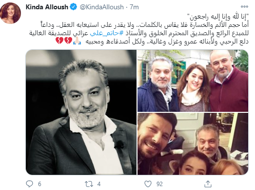 وكتبت الفنانة كندة علوش عبر حسابها على موقع التواصل الإجتماعى تويتر، "إنا لله وإنا إليه راجعون.. أما حجم الألم والخسارة فلا يقاس بالكلمات.. ولا يقدر على استيعابه العقل.. وداعاً للمبدع الرائع والصديق المحترم الخلوق حاتم علي عزائي للصديقة الغالية دلع الرحبي ولأبنائه عمرو وغزل وغالية".