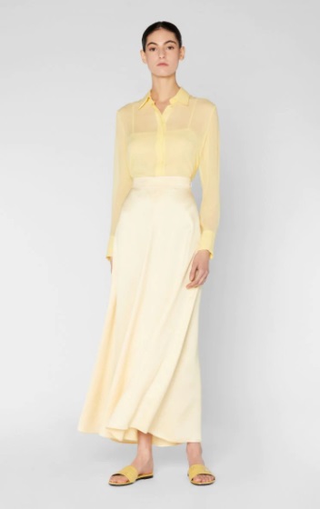 لإطلالة أكثر نعومة وأناقة، يُمكنكِ تنسيق قميص أصفر أنيق من الحرير، من ماركة Emilio Pucci، وهو قميص مُصمم من ياقة عريضة وأكمام طويلة، وأزرار أمامية، كما يُمكن ارتداء توب أوف وايت كبطانة له.