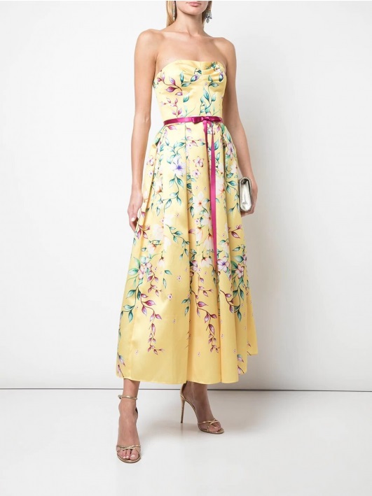 تنسيق فستان أصفر مطبع بالورود من Marchesa Notte