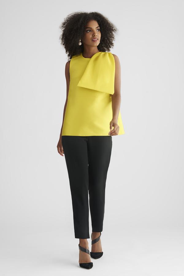 لإطلالة أنيقة تناسب الاجتماعات الرسمية أو الخروجات المسائية، قدمت ماركة Sachin & Babi هذه البلوزة الصفراء الأنيقة، المُصممة من مزيج من الحرير والبوليستر الأصفر، وهي بلوزة بدون أكمام ذات ياقة دائرية ضيقة. ويُمكن تنسيق هذه البلوزة الأنيقة، مع بنطلون أسود من الكريب، ذي تصميم أنيق بأرجل واسعة تتدرج حتى تصبح أضيق على أسفل الساقين، إضافة إلى حذاء أسود ذي كعب عالٍ ومقدمة أمامية مُدببة، وحقيبة كتف بنفس لون الحذاء.