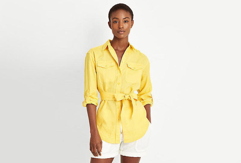 لإطلالة عملية تناسب الخروجات اليومية، قدمت ماركة Ralph Lauren، هذا التصميم المميز، لقميص أصفر طويل، مصُمم من قماش الكتان، ذي جيوب أمامية كبيرة الحجم على الصدر، مع أزرار أمامية وحزام عريض من نفس قماش القميص. ويُمكن تنسيق هذا القميص الأنيق مع بنطلون جينز أبيض، لإطلالة تناسب أوقات العمل أو الذهاب إلى الجامعة، أو شورت أبيض من الكتان، وصندل بدون كعب باللون البني، لإطلالة كاجوال نهارية تناسب الخروجات الصيفية السريعة.