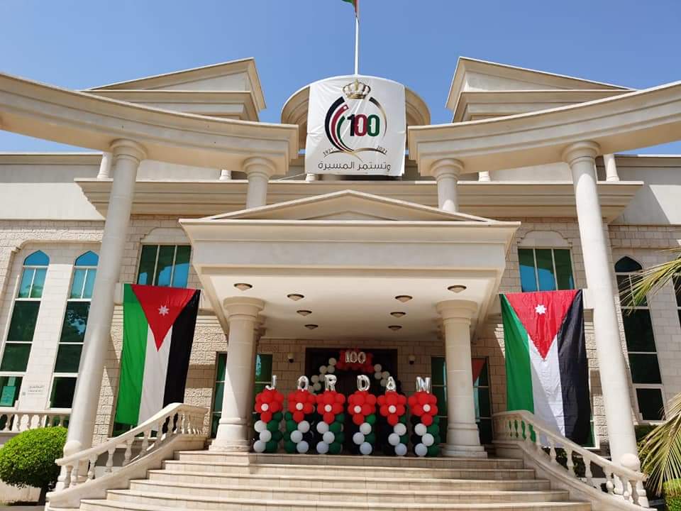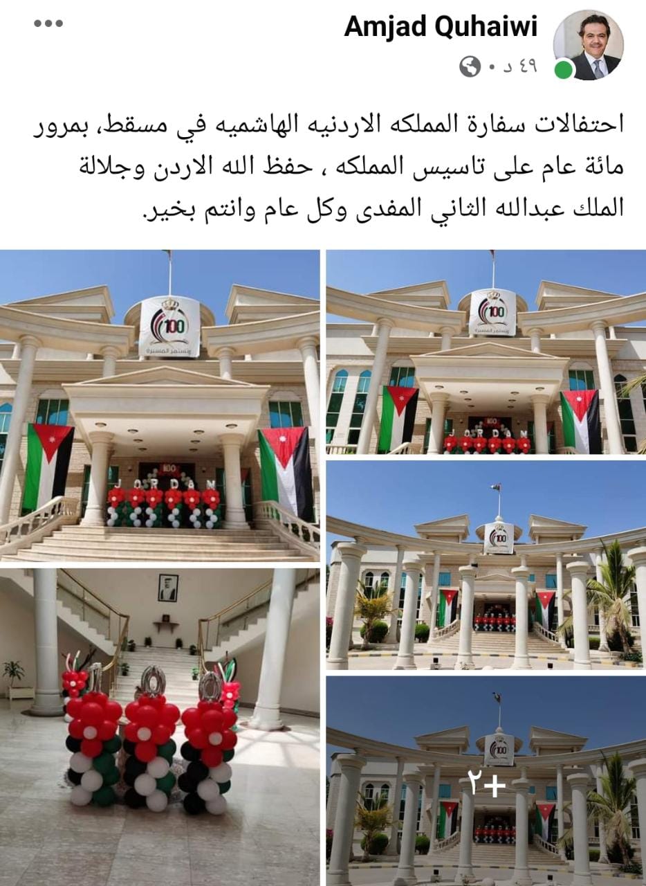 ونشر سفير المملكة الأُردنية الهاشمية، أمجد القهيوي، عبر منصة التواصل الاجتماعي (فيسبوك) منشوراً مرفقاً بصور للاعلام والاحتفال الذي تم في السفارة يقول فيه : "احتفالات سفارة المملكة الأُردنيّة الهاشمية في مسقط، بمرور مائة عام على تأسيس المملكة، حفظ الله الأُردن وجلالة الملك عبد الله الثاني المفدّى وكل عام وأنتم بخير."