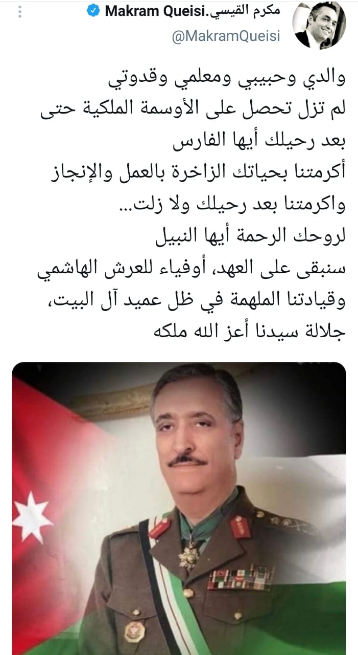 عمان جو - نشر السفير الأردني في باريس ووزير الشباب الأسبق مكرم القيسي تغريدةً على حسابه على توتير، بمناسبة التكريم الملكي لوالده الراحل الفريق مصطفى باشا القيسي، ضمن كوكبة المكرمين في الاحتفال الذي رعاه جلالة الملك عبدالله الثاني اليوم في الديوان الملكي الهاشمي.