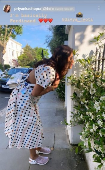 وظهرت بريانكا بفستان أبيض قصير وسط الشارع وهي منحنية لتشم ورود الياسمين.