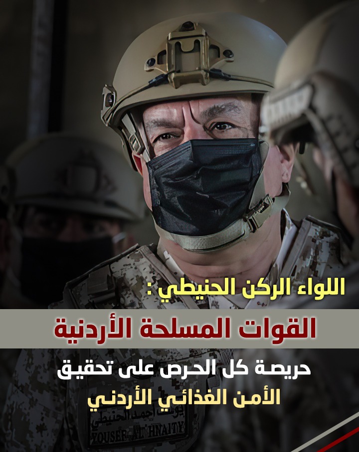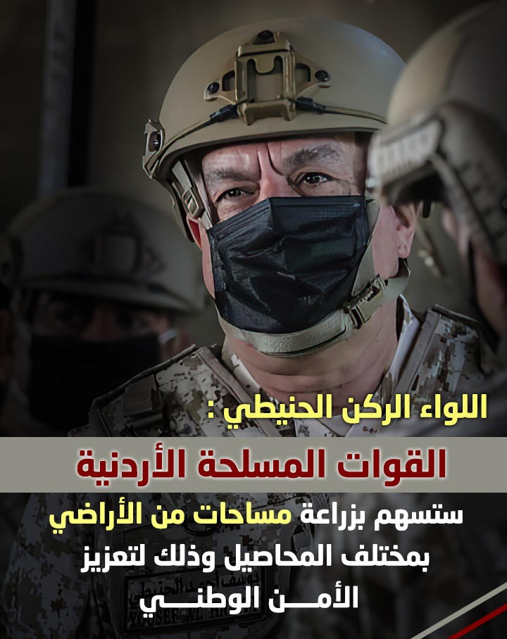 عمان جو - قال رئيس هيئة الأركان المشتركة في القوات المسلحة الأردنية اللواء الركن يوسف الحنيطي، إن القوات المسلحة الأردنية ستساهم بزراعة مساحات من الأراضي بمختلف المحاصيل، وذلك لتعزيز الأمن الغذائي الوطني.
