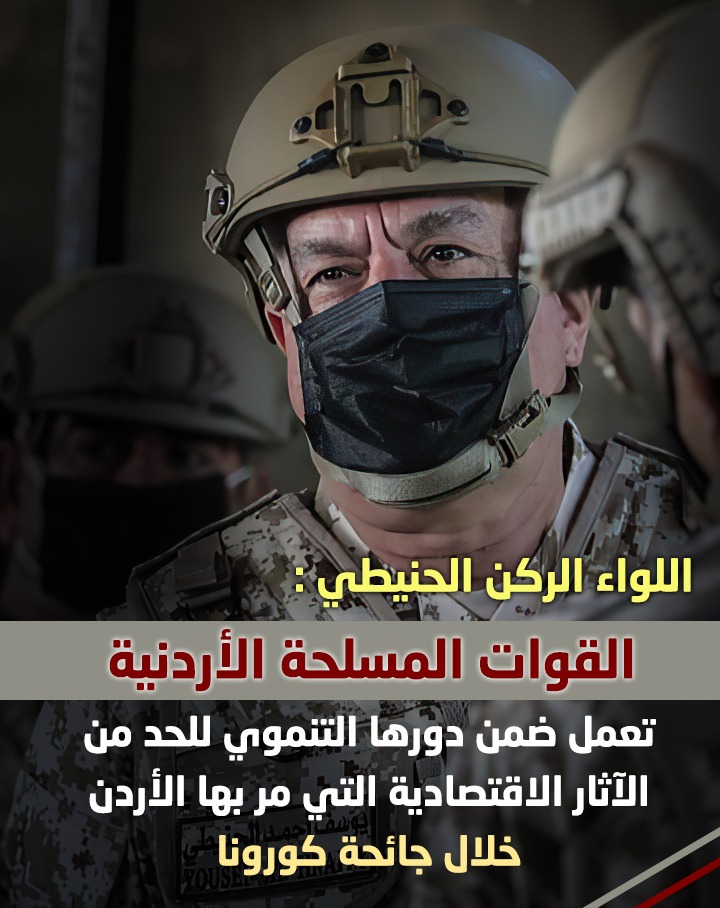وقال الحنيطي أن القوات المسلحة تعمل ضمن دورها الوطني التنموي للحد من الآثار الاقتصادية التي مر بها الاردن جراء جائحة كورونا.