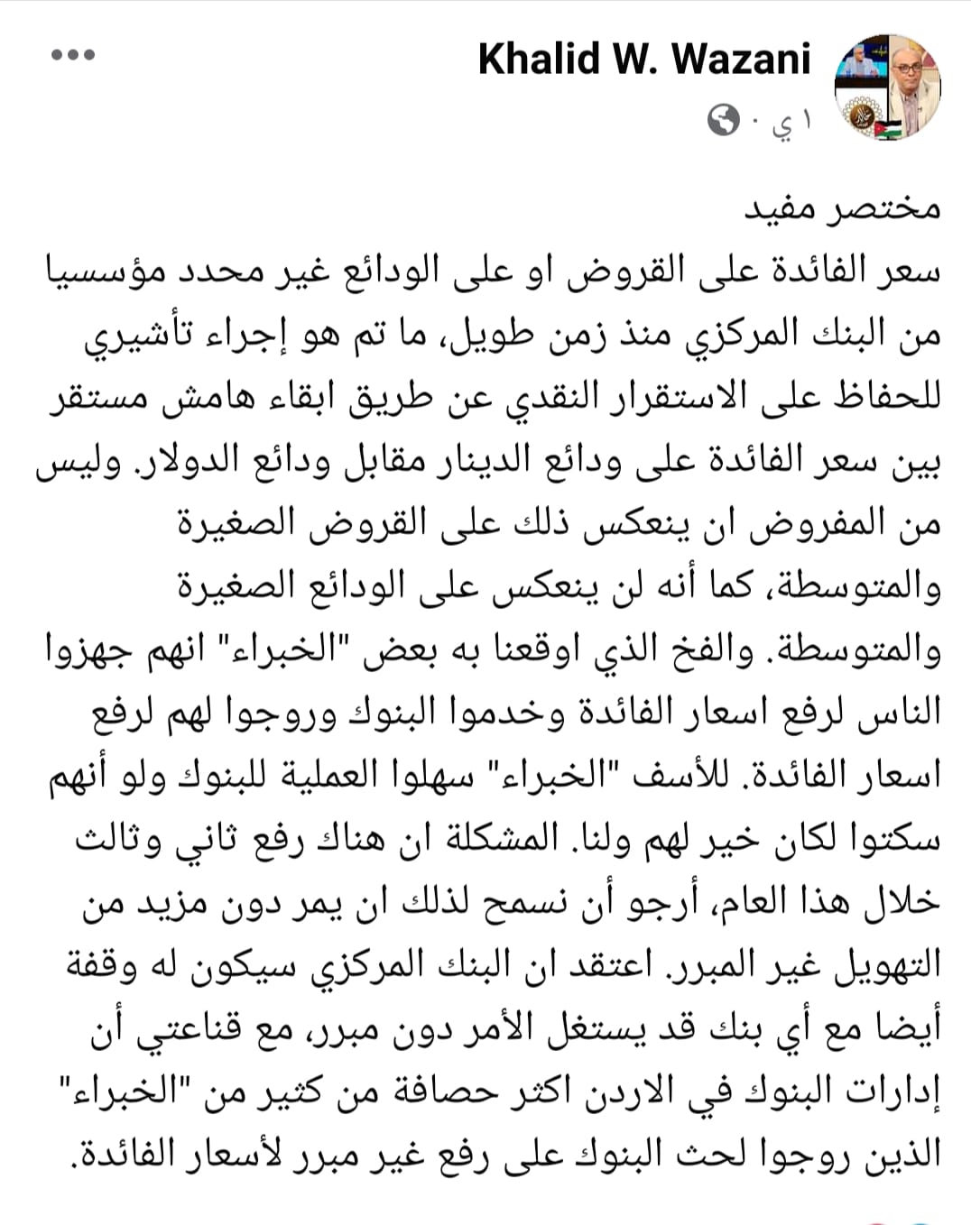 عمان جو - قال الدكتور خالد واصف الوزني، ان سعر الفائدة على القروض او على الودائع غير محدد مؤسسيا من البنك المركزي منذ زمن طويل، وذلك في بوست نشره عبر صفحته الرسمية على موقع "فيسبوك"، ردا على الضجة المثارة حول نية البنوك رفع قيمة الفائدة على قروض المواطنين، تباعا لقرار رفع الفائدة العالمي.