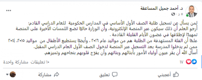 ونوه إلى ان الفئة المستهدفة من الطلبة هم من مواليد عام 2016، مشيرا إلى أنه يستطيع الأطفال من مواليد 2014 و2015 ممن لم يدخلوا المدرسة بعد التسجيل عبر المنصة لدخول الصف الأول العام الدراسي المقبل.