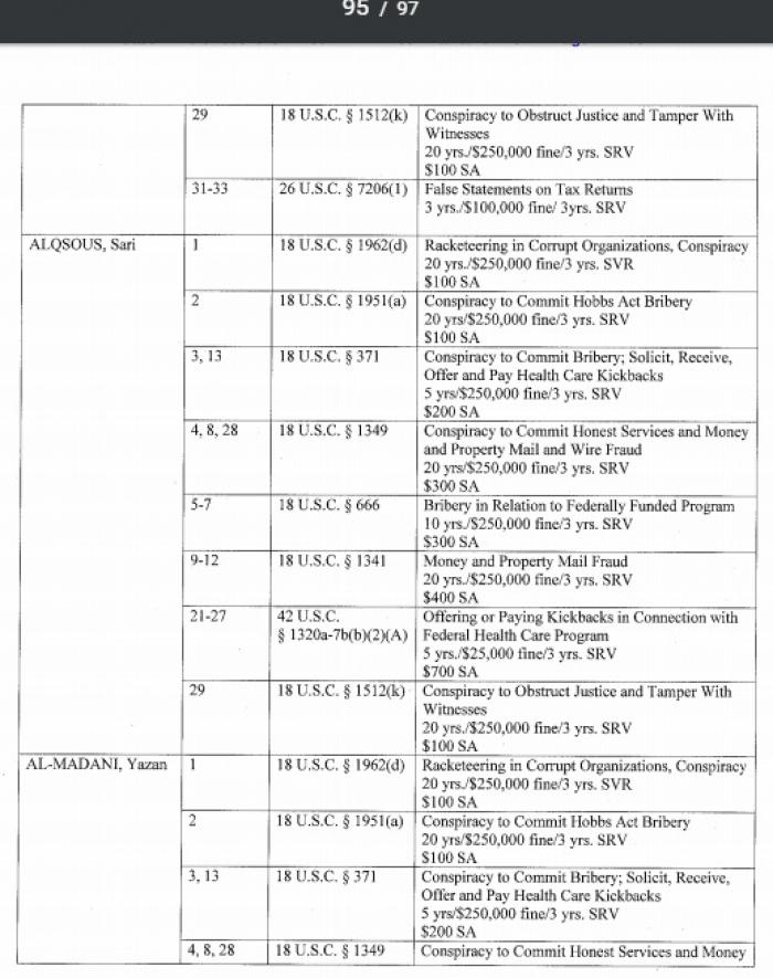 ويواجه المتهمين الاربعة عشرات التهم المنصوص عليها في لائحة اتهام من 93 صفحة، بما في ذلك الابتزاز والرشوة والتآمر لعرقلة سير العدالة والعبث مع الشهود، وتلقي رشاوى والإدلاء بأقوال كاذبة على الإقرارات الضريبية.