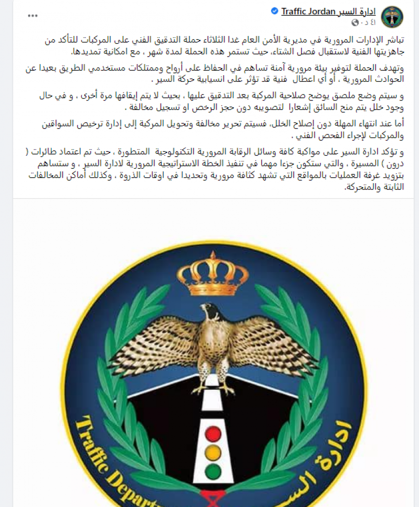 تباشر الإدارات المرورية في مديرية الأمن العام الثلاثاء حملة التدقيق الفني على المركبات للتأكد من جاهزيتها الفنية لاستقبال فصل الشتاء، حيث تستمر هذه الحملة لمدة شهر ، مع إمكانية تمديدها.