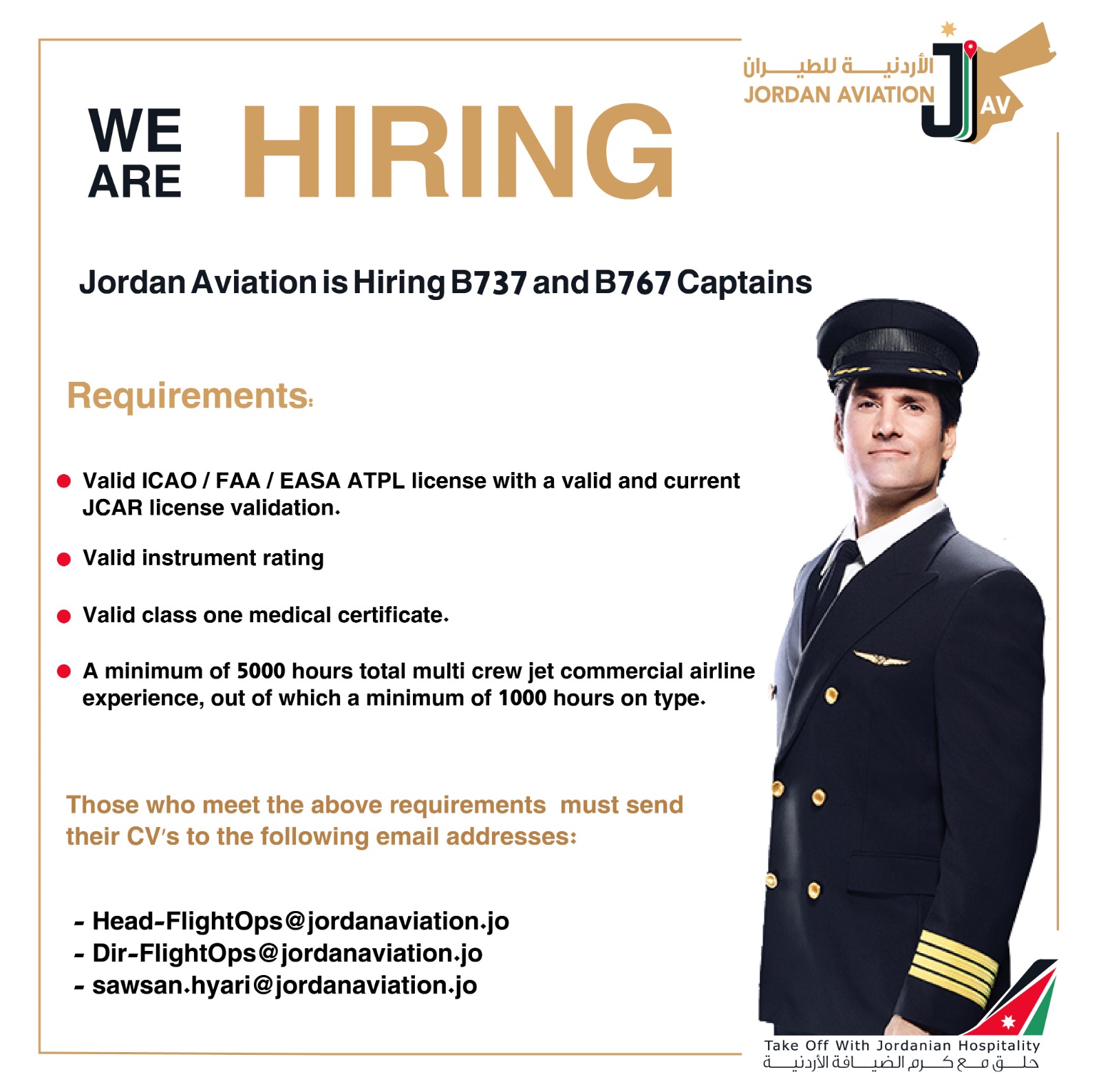 عمان جو -الأردنية للطيران تعلن عن توفر شواغر لقائد طائرة لأنواع الطائرات التالية : Boeing 737 + Boeing 767 التفاصيل حسب الأعلان المرفق