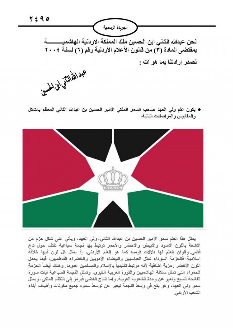 ويمثل هذا العلم، بحسب الجريدة الرسمية، سمو الأمير الحسين بن عبدالله الثاني، ولي العهد، ويأتي على شكل حزم من الأشعة باللون الأسود والأبيض والأخضر والأحمر ترتبط بها نجوم سباعية تلتف حول تاج فضي.