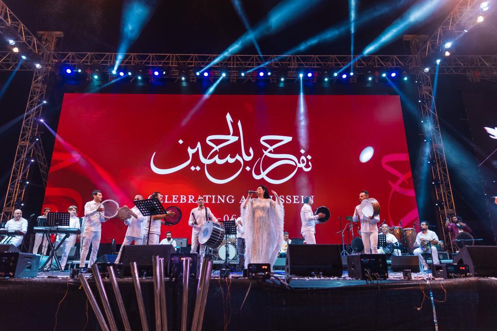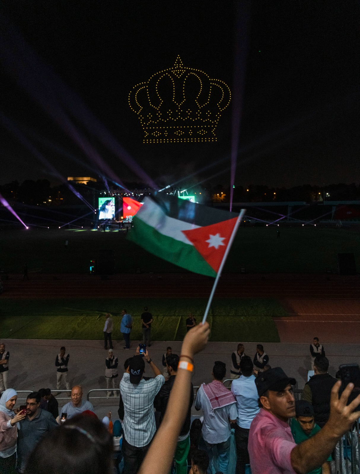 وبالتزامن مع غناءها حلق سرب من طائرات الدرون "بدون طيار" في سماء الملعب راسماً كلمة "نفرح بالحسين" ليزيد من حماس الجمهور الذي لم ينقصه الأمر اساساً بعد استماعه لنجمته الأولى.