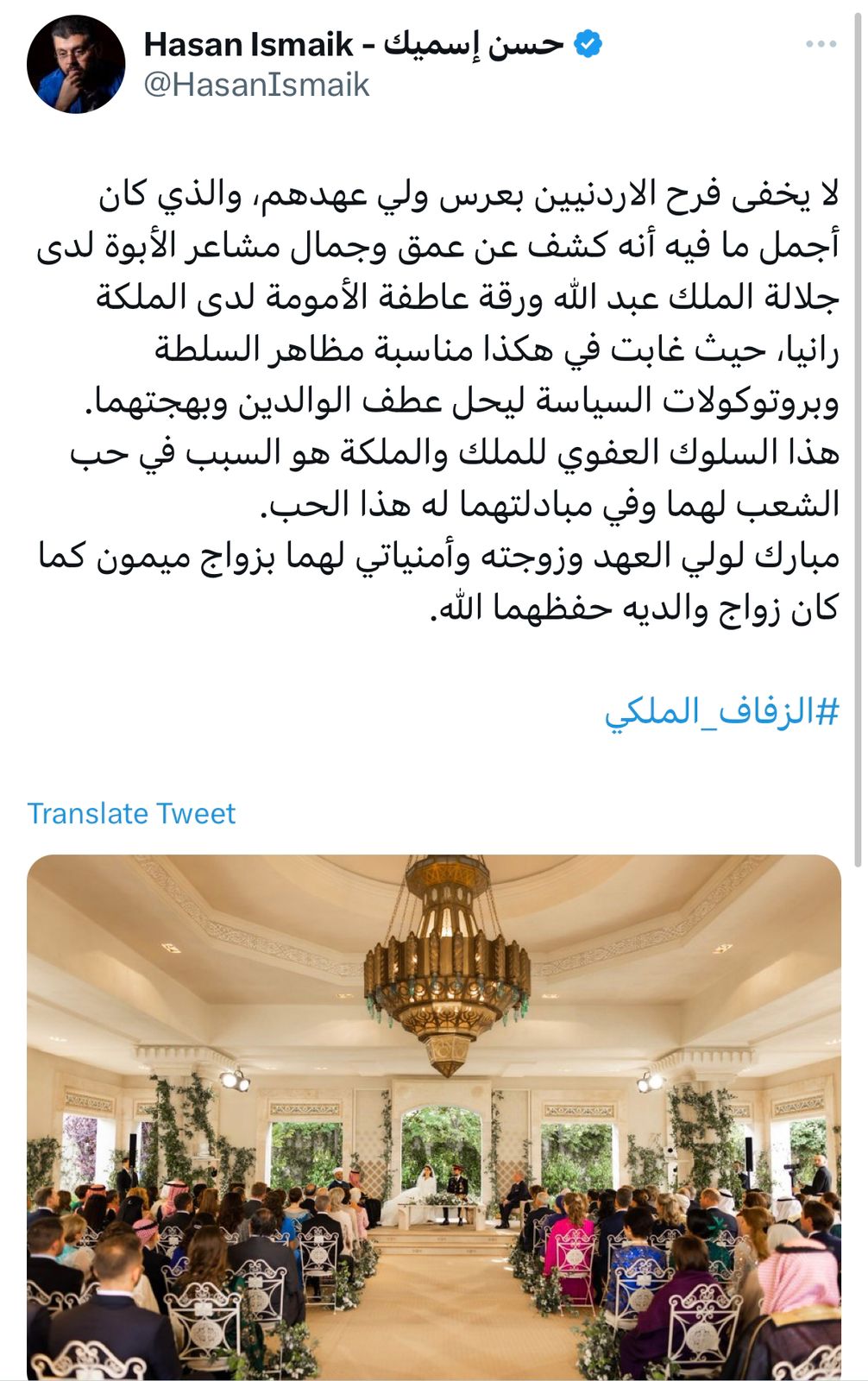 كتب رجل الاعمال والاقتصادي المعروف حسن اسميك منشوراً خاصاً على صفحته الشخصية على مواقع التواصل الاجتماعي يصف فيه روعة حفل الزفاف الملكي لسمو ولي العهد الامير الحسين المعظم .