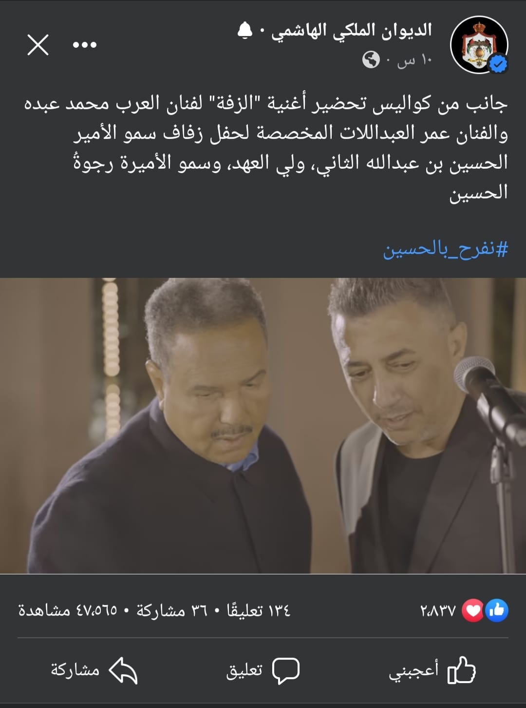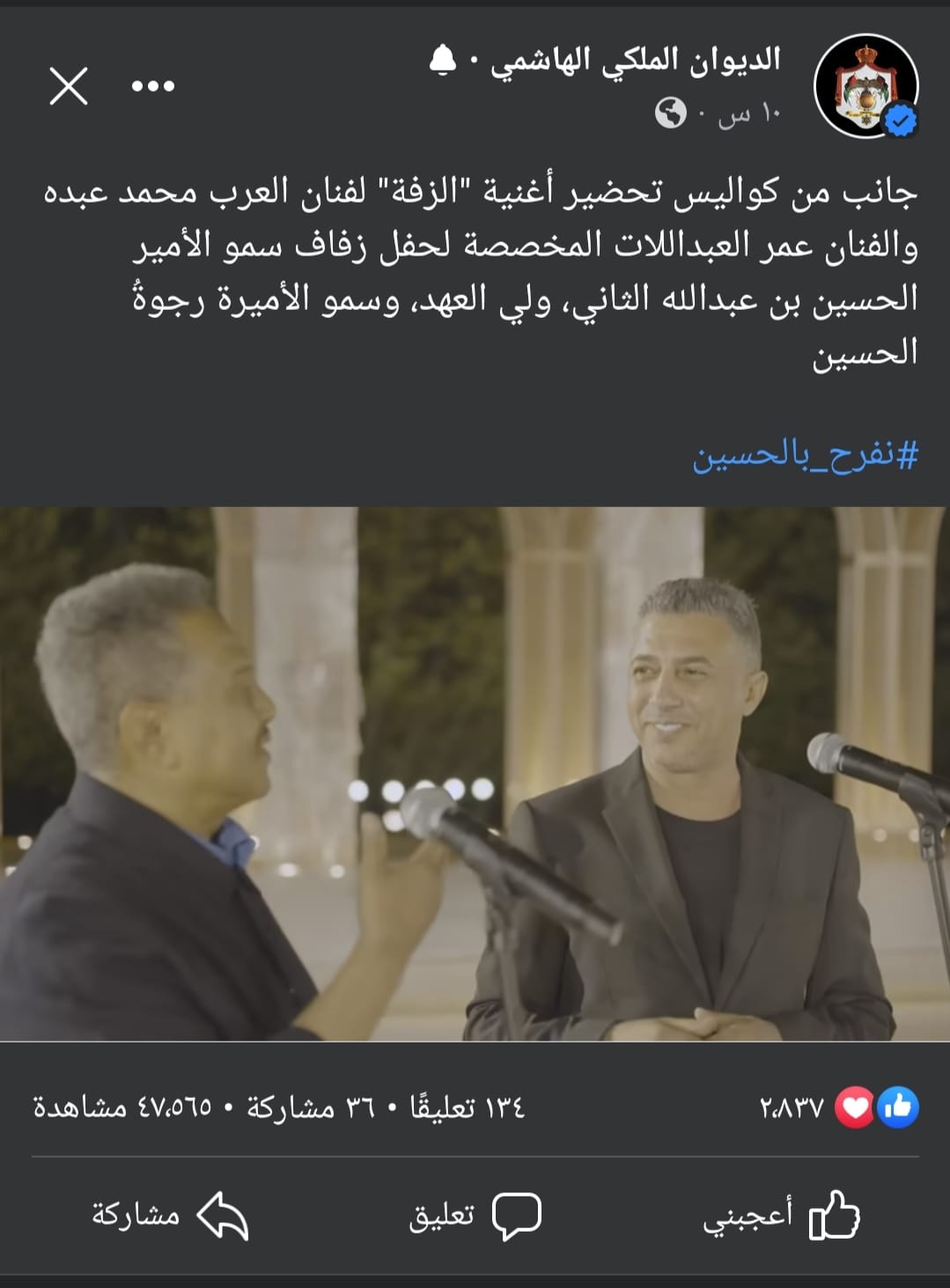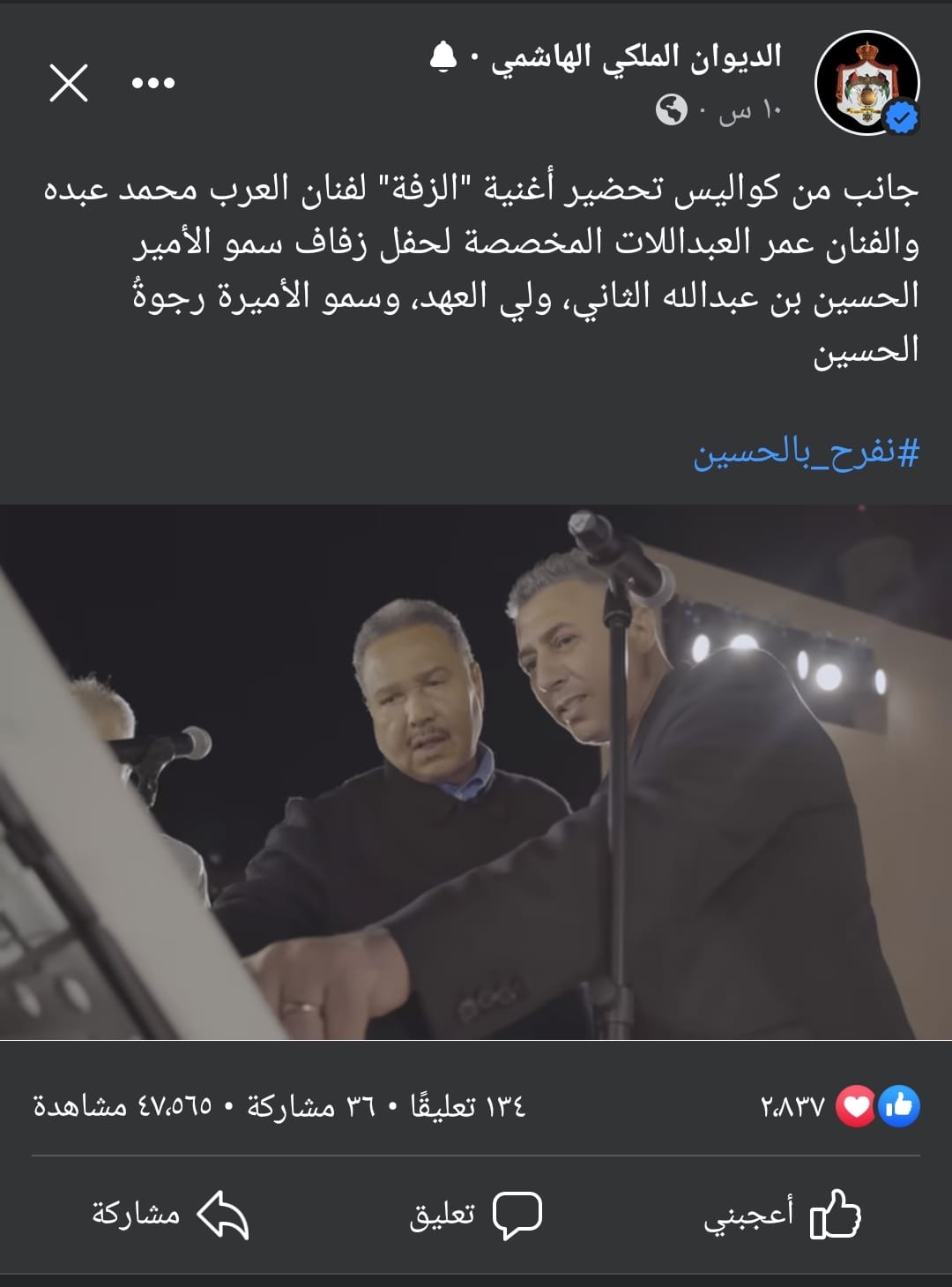 عمان جو - نشر الحساب الرسمي للديوان الملكي الهاشمي العامر على مواقع التواصل الإجتماعي الخاصة به تفاصيل كواليس تحضير العمل الفني الكبير "الحسين ورجوة"، الذي قدمه الفنانان محمد عبده وعمر العبداللات في حفل زفاف سمو ولي العهد الأمير الحسين بن عبدالله الثاني، وسمو الأميرة رجوة الحسين.