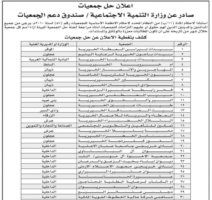 ودعت وزارة التنمية، الدائنين والمدينين الذين لهم حقوق أو عليهم التزامات للجمعيات أدناه مراجعة لجنة حلّ الجمعية المبينة إزاء كل جمعية خلال شهر من تاريخه.