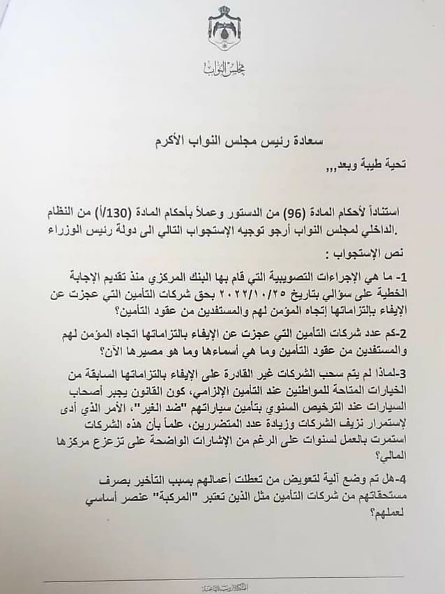واستفسر النائب عن حلول البنك المركزي لهذه القضية وفي حال قام بحصر عدد المتضررين وقيمة المبالغ المالية المطلوبة وفي حال قام البنك بإعطاء أولوية بالتعويض لمن تعطلت أعمالهم بسبب التأخر بصرف مستحقاتهم وخاصة الذين تعتبر "المركبة" عنصر أساسي لعملهم، بالإضافة للحوادث التي نجم عنها وفيات حتى لا يحدث مشاكل بين المواطنين الذين اتفقوا على الصلح والعفو عن المتسبب بالحادث باستثناء مبلغ التأمين.