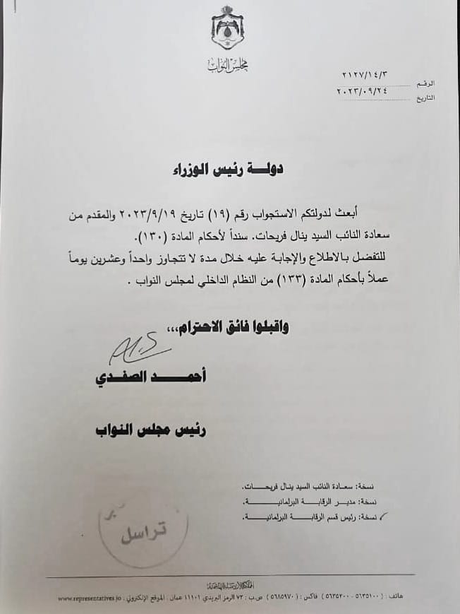 استناداً لأحكام المادة (٩٦) من الدستور وعملاً بأحكام المادة (١٣٠/أ) من النظام الداخلي لمجلس النواب أرجو توجيه الإستجواب التالي الى دولة رئيس الوزراء.