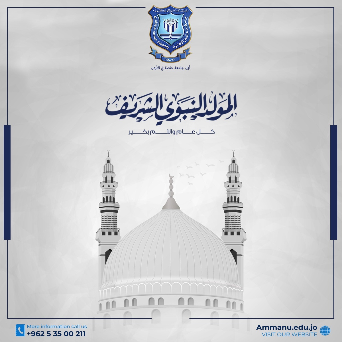 عمان جو- أسرة جامعة عمان الأهلية ممثلة برئيس مجلس الأمناء دولة الأستاذ عبدالكريم الكباريتي وأعضاء المجلس ورئيس هيئة المديرين الدكتور ماهر الحوراني وأعضاء الهيئة ورئيس الجامعة الأستاذ الدكتور ساري حمدان وأعضاء الهيئتين التدريسية والإدارية وطلبة الجامعة، يتقدمون بمناسبة ذكرى المولد النبوي الشريف بالتهنئة والتبريك من قيادتنا الهاشمية وعلى رأسها جلالة الملك عبدالله الثاني ابن الحسين المعظم ومن الشعب الاردني ومن أمتنا العربية والأمة الاسلامية ، داعين الله عز وجل ان يعيد هذه الذكرى العطرة المباركة عليهم جميعا بالخير والبركات .