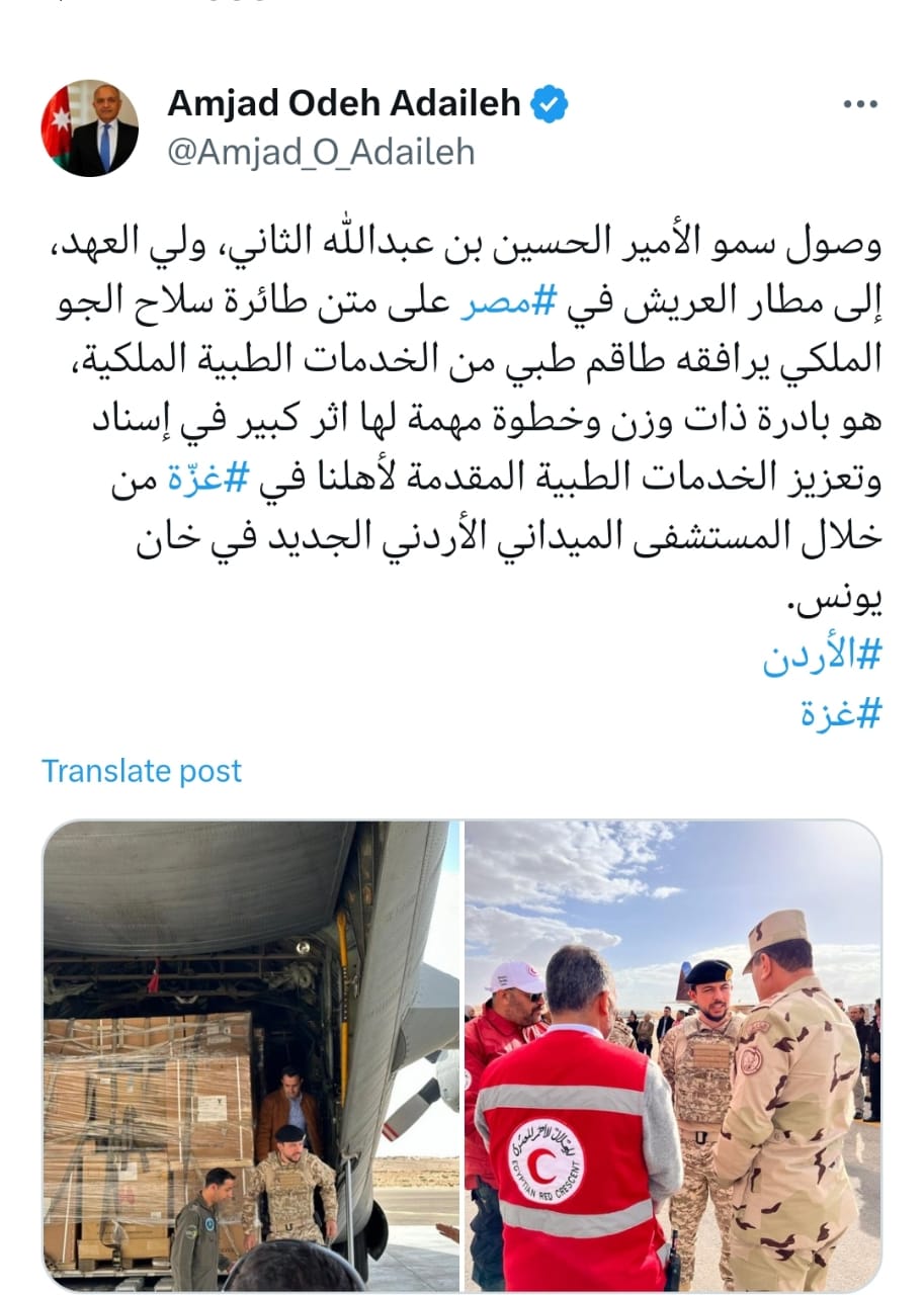 وقال العضايلة في تغريدة له اليوم "وصول سمو الأمير الحسين بن عبدالله الثاني، ولي العهد، إلى مطار العريش في #مصر على متن طائرة سلاح الجو الملكي يرافقه طاقم طبي من الخدمات الطبية الملكية، هو بادرة ذات وزن وخطوة مهمة لها اثر كبير في إسناد وتعزيز الخدمات الطبية المقدمة لأهلنا في #غزّة من خلال المستشفى الميداني الأردني الجديد في خان يونس".