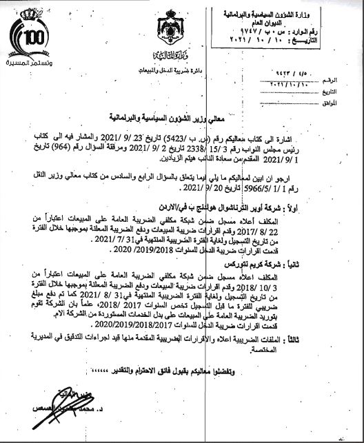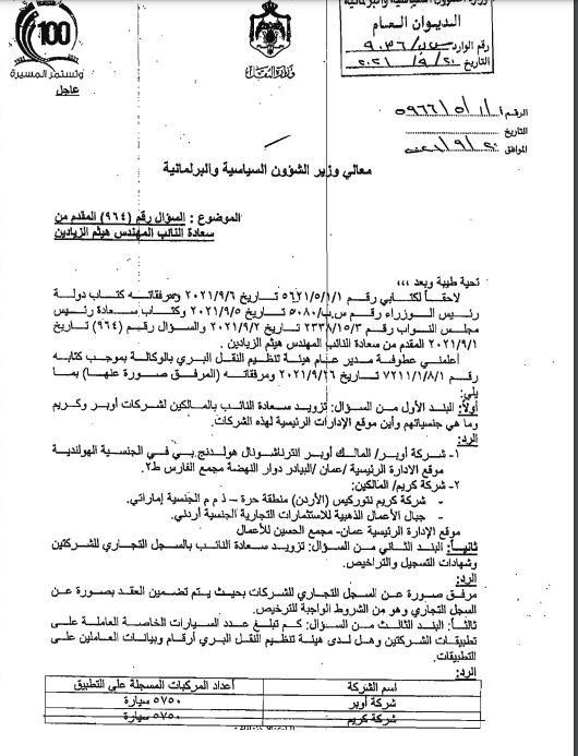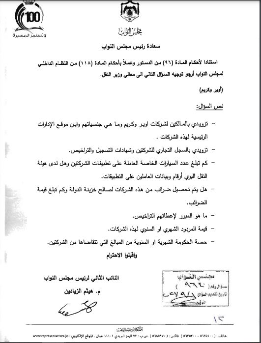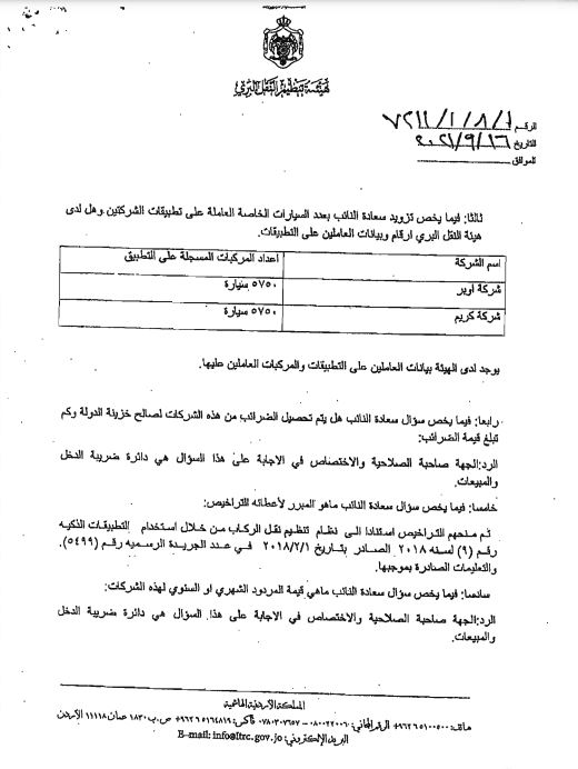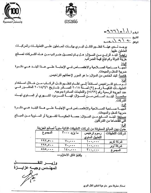 عمان جو-تستوفي الحكومة من شركات التطبيقات الذكية " أوبر - كريم" مبلغ 585 ألف دينار، بحسب رد الحكومة على سؤال النائب هيثم زيادين حول حصة الحكومة الشهرية أو السنوية من المبالغ التي تتقاضاها من الشركتين.