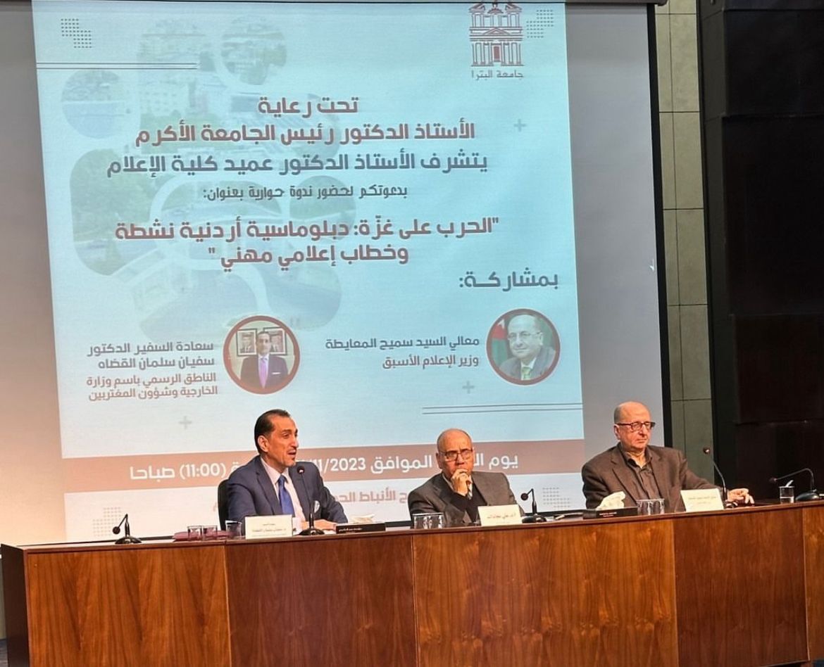 نظمت جامعة البترا اليوم الثلاثاء تحت رعاية رئيس الجامعة الاستاذ الدكتور رامي عبد الرحيم ندوة حوارية بعنوان (الحرب على غزة :دبلوماسية أردنية نشطة وخطاب إعلامي مهني) تحدث فيها الوزير الأسبق سميح المعايطة والناطق الاعلامي لوزارة الخارجية وشؤون المغتربين السفير سفيان القضاة .