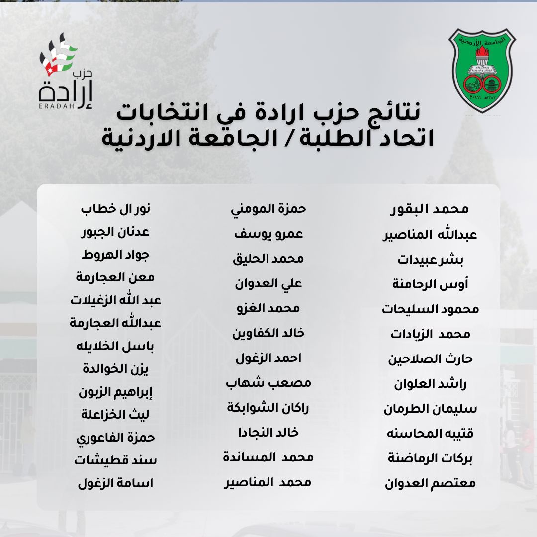 عمان جو- من أم الجامعات ومنارة العلم في وطننا المهيب ، حصل الطلبة المرشحين في القوائم المحسوبة على حزب إرادة على ٣٧ مقعد من أصل (١١١) مقعد تشكل إجمالي مقاعد إتحاد طلبة الجامعة الأردنية.