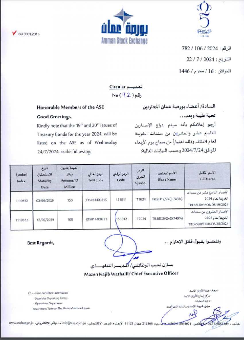 وبحسب التعميم فإن قيمة الإصدار التاسع عشر من سندات الخزينة بقيمة 150 مليون دينار، وتاريخ استحقاقه سيكون في 3 حزيران 2029.