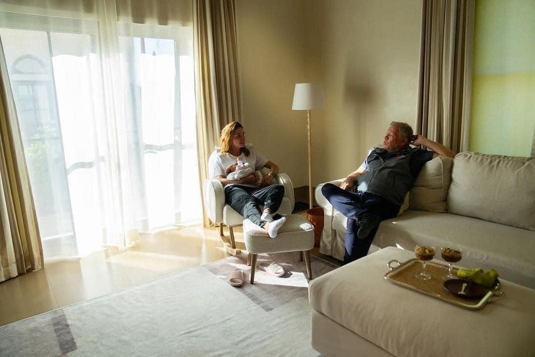 عمان جو - شادي سمحان - في صورة إنسانية بالغة التأثير ، ظهور فيها صاحبا الجلالة الملك عبدالله الثاني المعظم وجلالة الملكة رانيا المعظمة تحتضن “الحفيدة الكتكوتة ايمان" بأجواء عائلية متواضعة تشبه حياة الأردنيين المحتفلين بأول حفيدة تزور بيت الجد ..