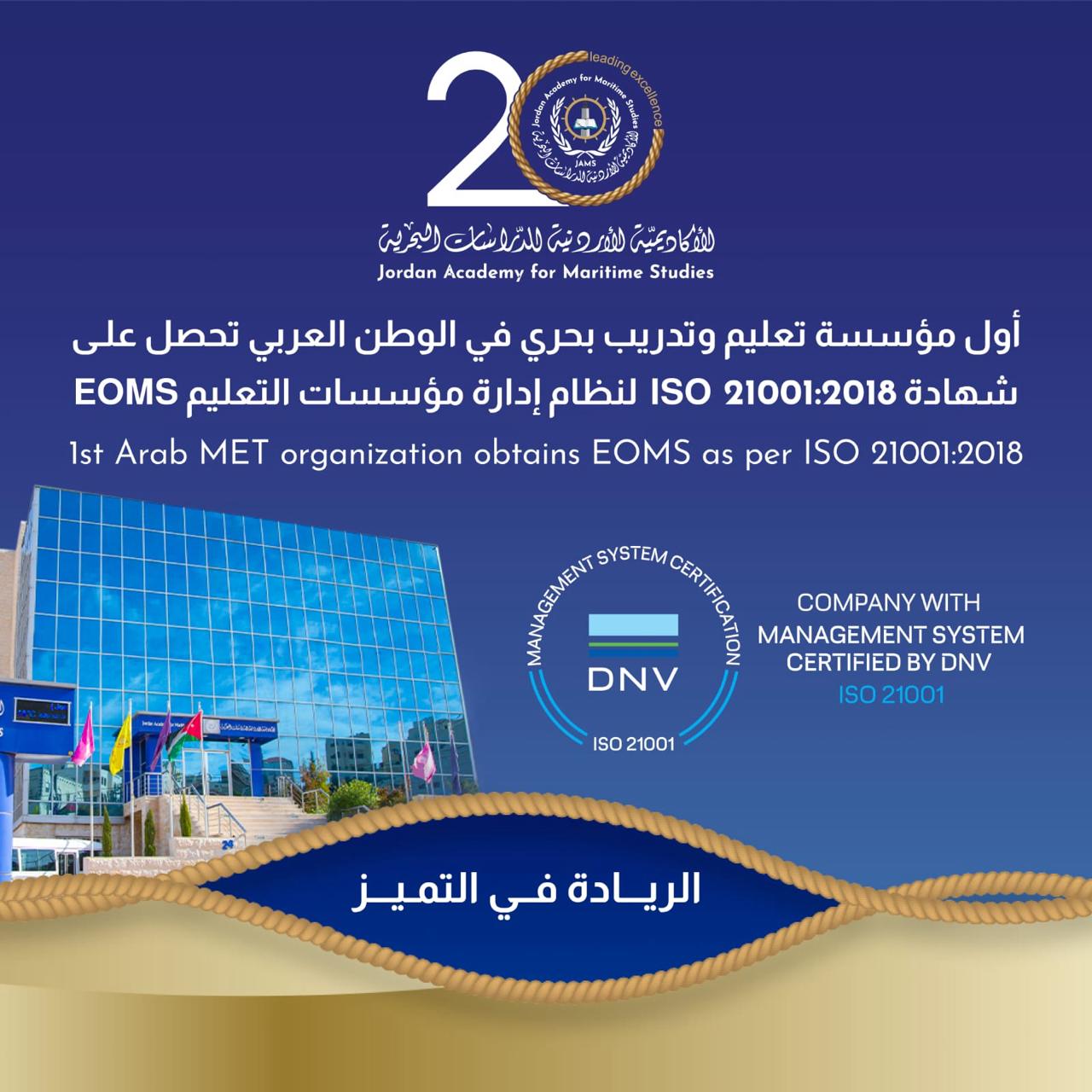#Jordan_Academy_for_Maritime_Studies , #JAMS as #MET leading provider, is proud to announce that it has been awarded the prestigious Educational Organization Management System (EOMS) Certificate as per ISO 21001:2018 by the #DNV Foundation, after the full-system audit that covers all JAMS activities without registering any Non-conformance