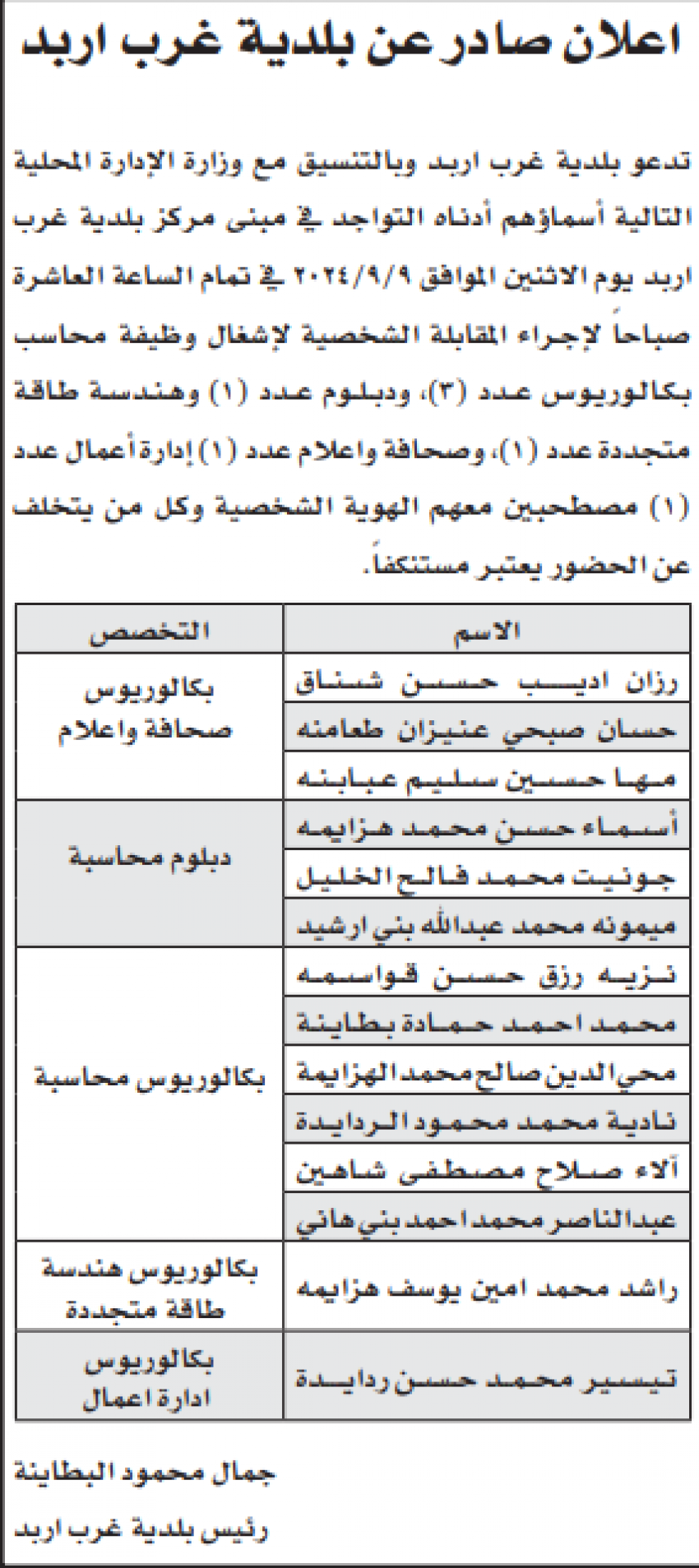 دعت عددا من المؤسسات والوزارات ، اليوم الخميس، مرشحين اجتازوا الامتحان التنافسي للحضور المقابلة الشخصية لغاية استكمال اجراءات التعيين لديها.