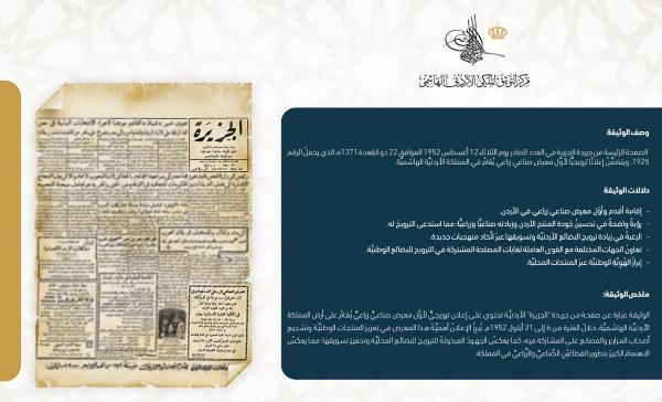 التوثيق الملكي يعرض وثيقة إعلان أول معرض صناعي زراعي بالأردن