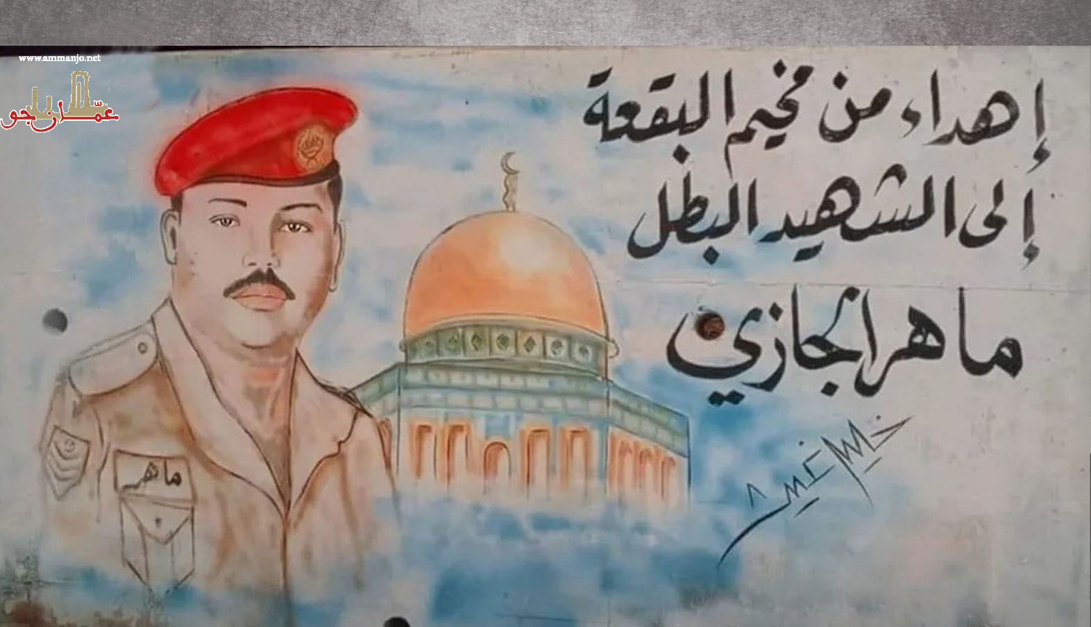 عمان جو – صورة لجدارية في مخيم البقعة رُسمت إهداءً لـ”مـاهر الجـازي” منفذ عملية معبر الكرامة والذي قتل خلالها 3 إسرائيليين، ونشر الصورة شقيقه على فيسبوك.
