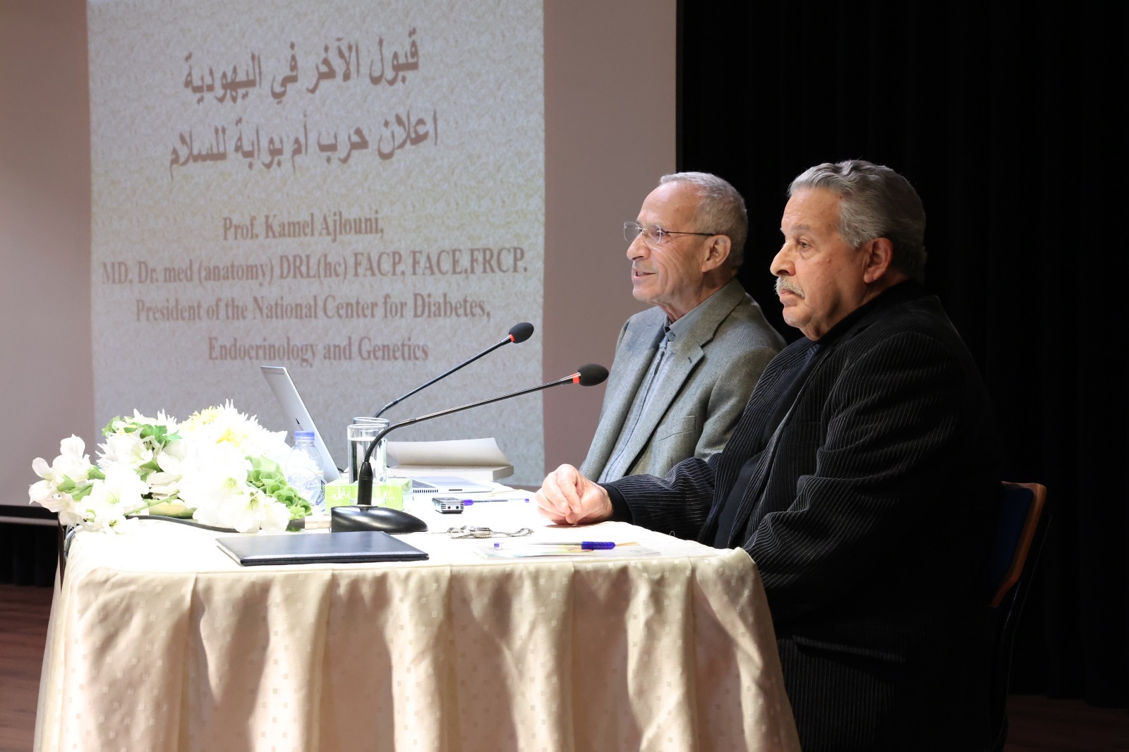 عمان جو - وصف الأستاذ الدكتور أسعد عبد الرحمن معالي الأستاذ الدكتور كامل العجلوني رئيس المركز الوطني للسكري والغدد الصم والوراثة الأردني بــ "بالطبيب البارع، والأكاديمي الباحث، والمؤرخ في اختصاصه الطبي، وبـ "القامة العلمية والفكرية ذات البصمة المميزة، الذي يتمتع برؤية ثاقبة وفهم عميق للقضايا المعقدة حتى التي تقع منها حارج سياق تخصصه الطبي". وعليه، ليس غريبا أن البروفسور العجلوني كان قد حصل على عديد الجوائز الطبية وعلى عدد من الأوسمة. مثلما وصفه بــ "الأخ والصديق الحبيب الذي يكاد يكون أول من عرفت عندما أقمت في الأردن في العام 1983، والذي كان فاز –بكل كفاءة واقتدار- بجائزة عبدالحميد شومان للعلماء العرب الشبان في أول دورة فيها، عندما كنت مديرا عاما لمؤسسة عبدالحميد شومان من 1981-1996"، مشيرا إلى أن "هذه المحاضرة ليست الاولى له في "منتدى العصرية" ولن تكون الأخيرة، حيث سبق وحاضر فيه في موضوعات شتى بوصفه صديقا دائما لــ "المنتدى"، مضيفا: "رغم أن حياة الدكتور العجلوني مكرسة للعلوم الطبية التي برع فيها وأبدع أيما إبداع، إلا أن لديه نشاطا مميزا في مجال دراسة الأديان المقارنة، والذي غدا فيه أيضا علما ومرجعا بارزا؛ لذا أردنا الإستفادة من خبراته وقراءاته النقدية والمعرفية حول الجذور والمفاهيم الدينية عند اليهود.