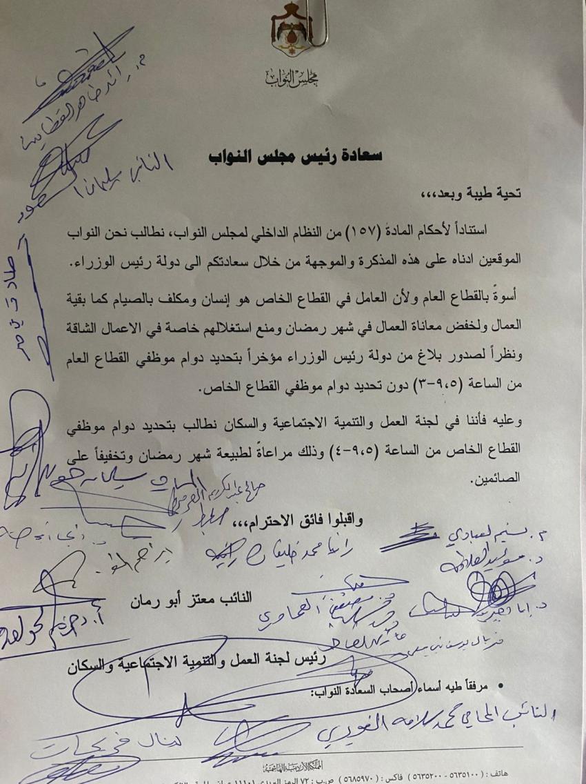 وأكد رئيس اللجنة، النائب معتز أبو رمان، أن الحكومة حددت ساعات العمل في القطاع العام، لكنها لم تشمل القطاع الخاص بقرار مماثل.