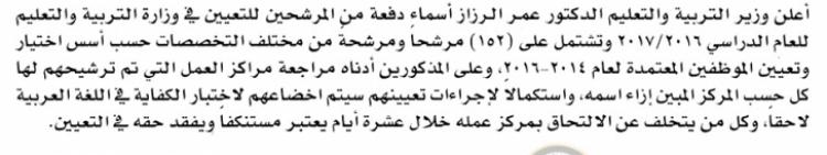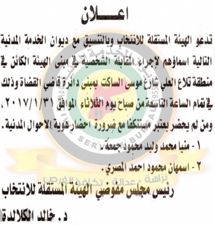 يدعو ديوان الخدمة المدنية بالتعاون مع وزارة التربية ومختلف الوزارات والمؤسسات الحكومية، التالية اسماؤهم لاجراء المقابلات الشخصية وعقد الامتحان التنافسي لغايات التعيين.