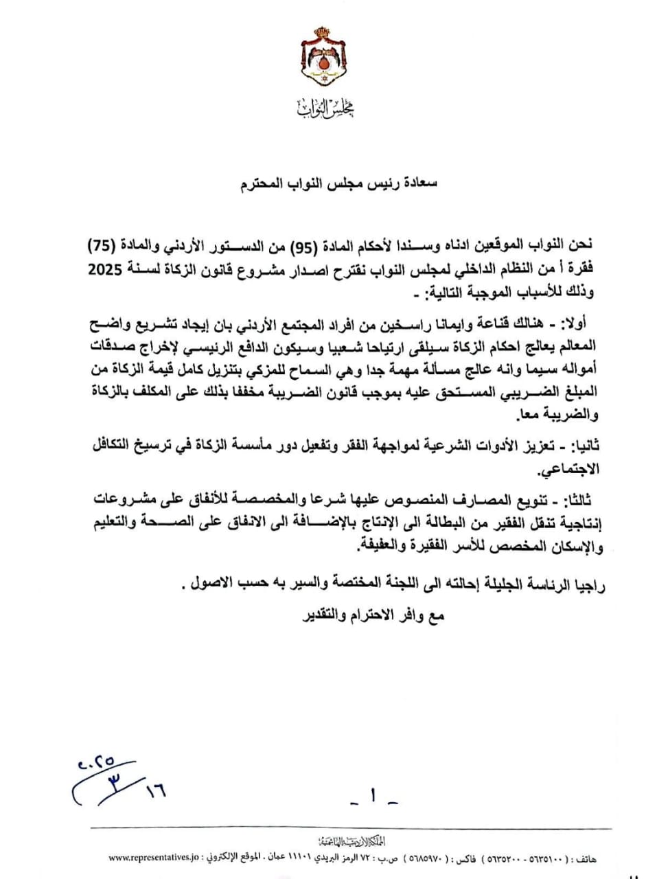 نحن النواب الموقعين ادناه وسندا لأحكام المادة (95) من الدستور الأردني والمادة (75) فقرة أ من النظام الداخلي لمجلس النواب نقترح اصدار مشروع قانون الزكاة لسنة 2025 وذلك للأسباب الموجبة التالية: -