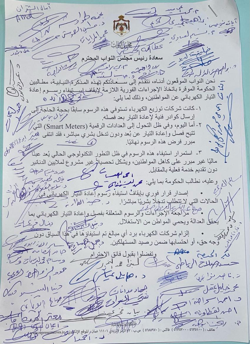 قدم عدد من النواب مذكرة نيابية طالبوا فيها الحكومة باتخاذ إجراءات عاجلة لإيقاف استيفاء رسوم إعادة التيار الكهربائي عن المواطنين.