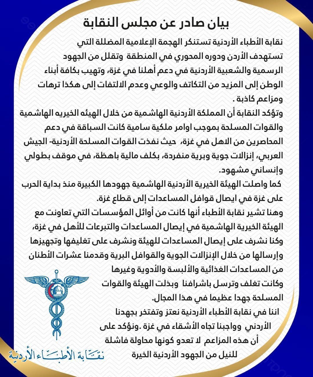 اننا في نقابة الأطباء الأردنية نعتز وتفتخر بجهدنا الأردني وواجبنا تجاه الأشقاء في غزة .ونؤكد على أن هذه المزاعم لا تعدو كونها محاولة فاشلة للنيل من الجهود الأردنية الخيرة