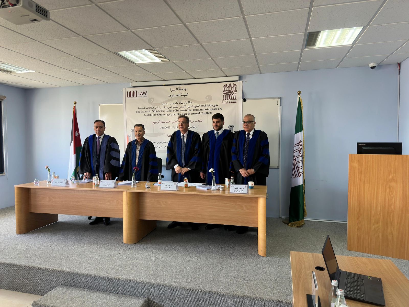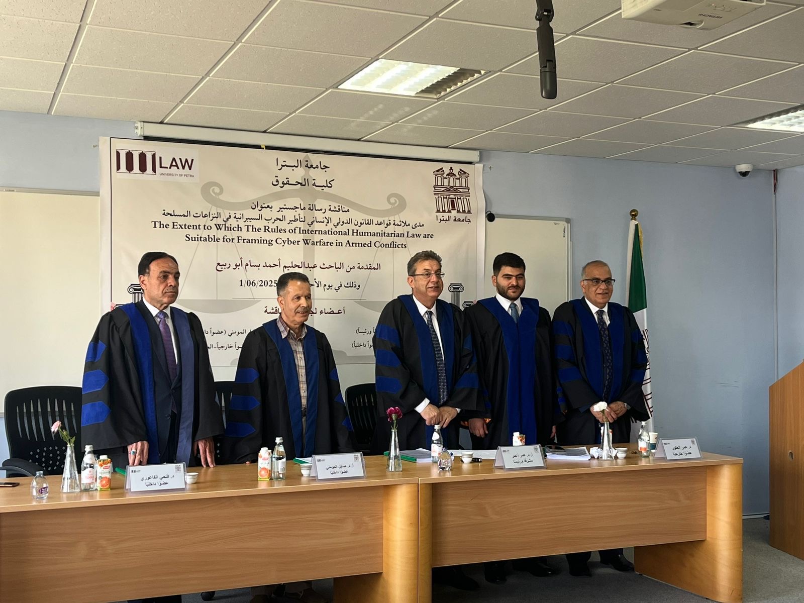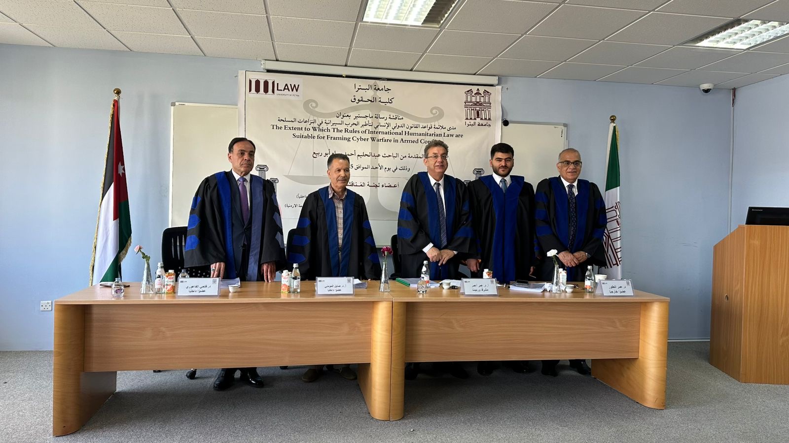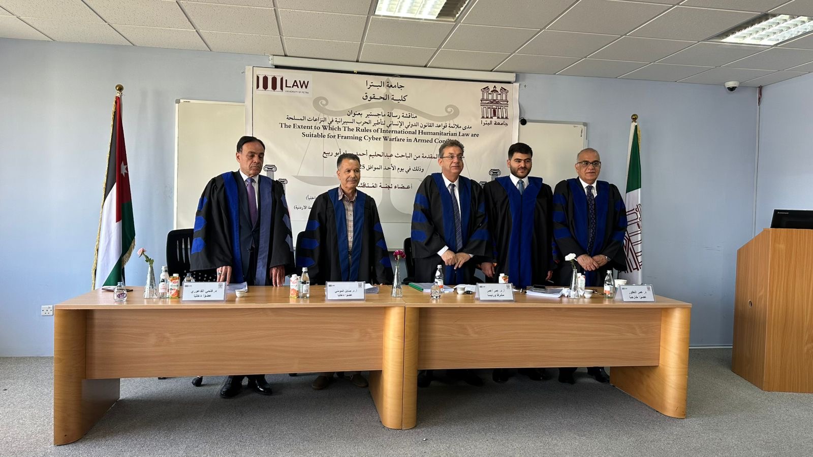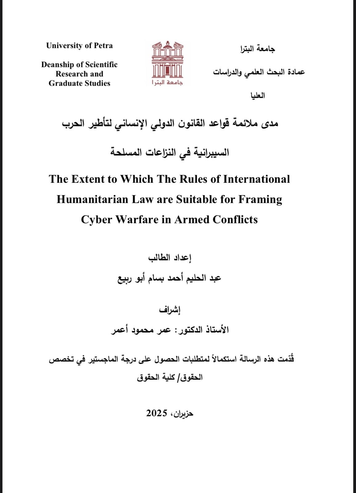 عمان جو- أنهى الباحث عبد الحليم أحمد بسام أبو ربيع متطلبات الحصول على درجة الماجستير في القانون من جامعة البترا وذلك بعد مناقشة رسالته العلمية الموسومة بعنوان مدى ملائمة قواعد القانون الدولي الإنساني لتأطير الحرب السيبرانية في النزاعات المسلحة