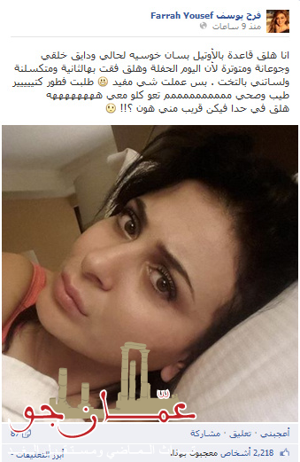نشرت الفنانة السورية فرح يوسف نجمة برنامج Arab idol صورة لها، وهي داخل فندق سان خوسيه في الولايات المتحدة الأميركية، وكشفت أنها تشعر بالقلق والخوف من الحفلة التي ستحييها هناك , وقالت: "أنا الآن في فندق بسان خوسيه لحالي، جائعة ومتوترة ﻷن اليوم الحفلة ومازلت في السرير، لكنني قمت بأمر مفيد، طلبت فطورًا صحيًا تفضلوا".