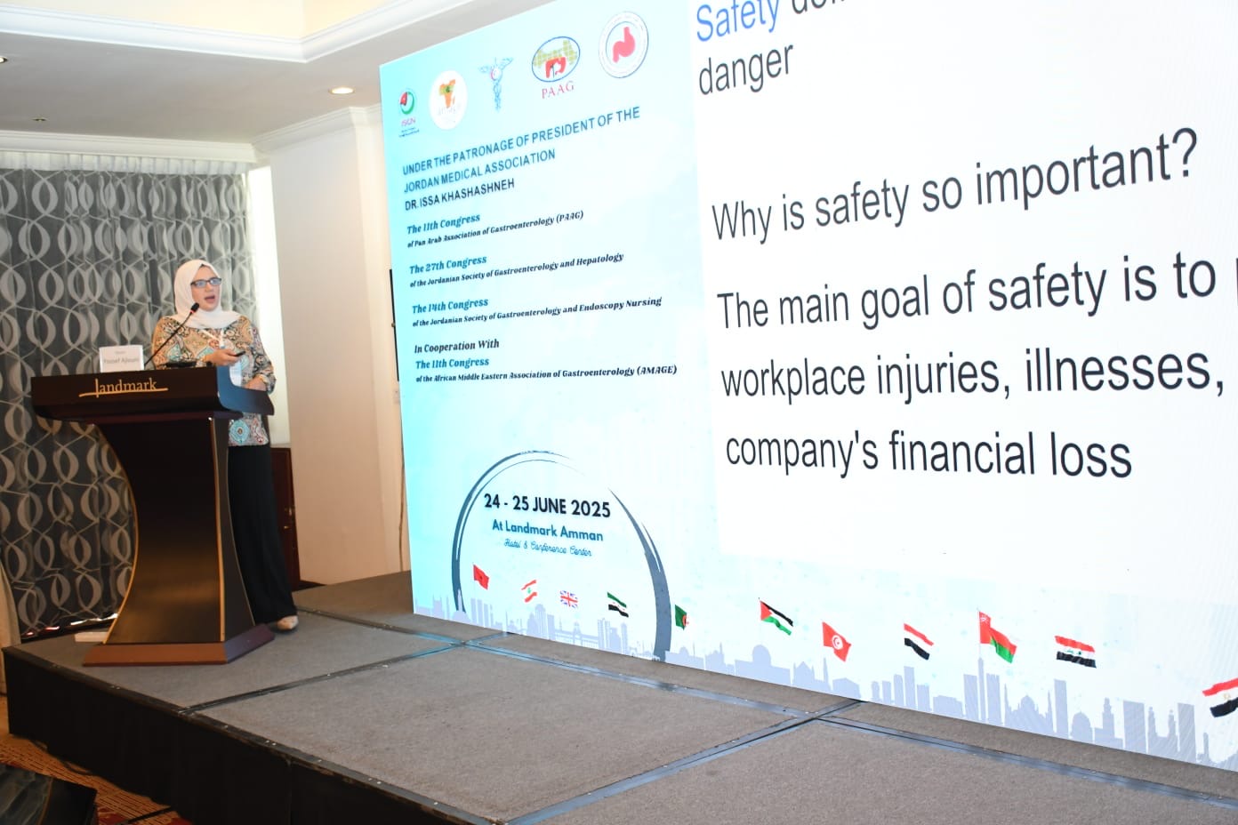 وقدمت الممرضة آيات ناصر رئيسة قسم التنظير في مستشفى الكندي محاضرة في المؤتمر بعنوان السلامة في أقسام التنظير بينت خلالها أهمية تطبيق معايير السلامة في هذه الاقسام من خلال الالتزام بسياسات ضبط ومكافحة العدوى خاصة فيما يتعلق بإعادة معالجة المناظير وخضوع غرف التنظير لنفس معايير غرف العمليات المعقمة وارتداء العاملين اللباس المعقم والتدريب المستمر والتأهيل للكوادر للالتزام بتطبيق هذه المعايير والسياسات .