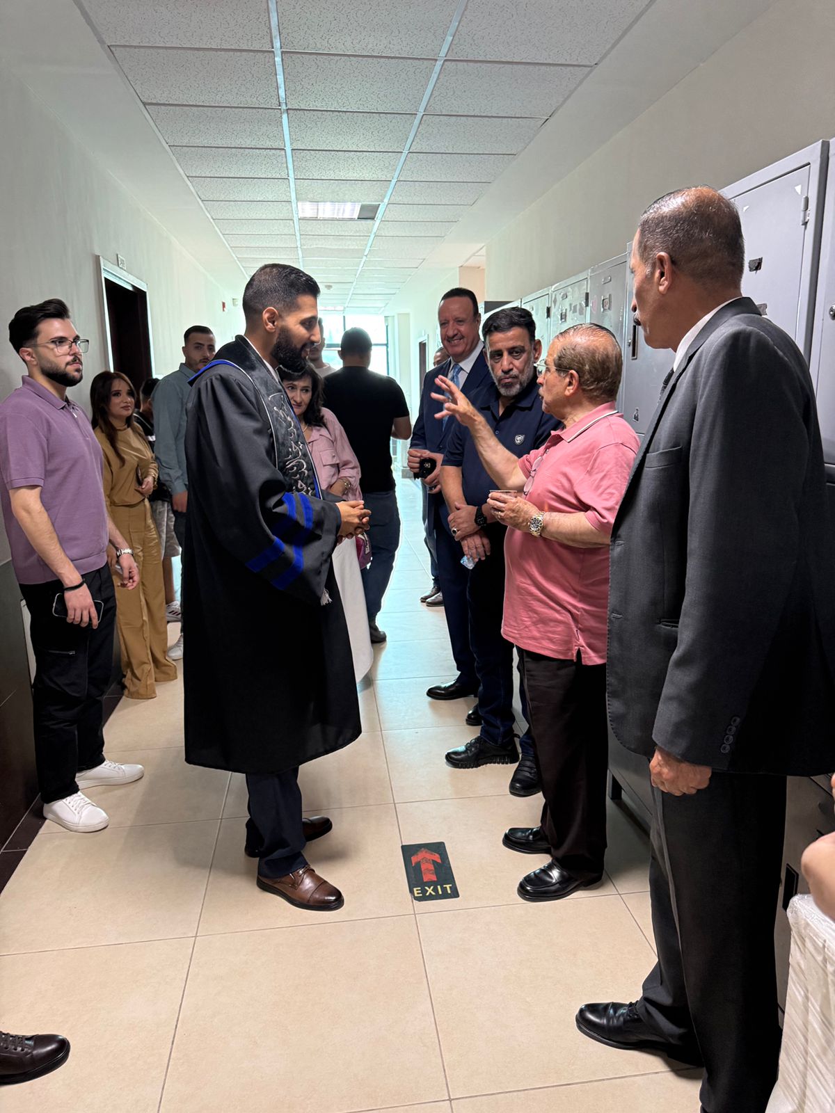أقيمت المناقشة في حرم الجامعة بحضور حشد من الأكاديميين والمهتمين، يتقدمهم ضيوف الشرف سعادة العين الدكتور غازي الطيب، وسعادة المهندس نديم الفقهاء إلى جانب عائلة الباحث وأصدقائه ونخبة من الباحثين المتخصصين في مجال الإعلام.