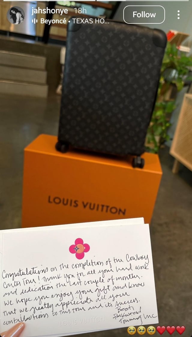 وحرص العديد من الراقصين على استعراض هذه الهدية الفخمة عبر السوشيال ميديا، معبّرين عن سعادتهم بهذه اللفتة المميزة، وقد دُوّن في الرسالة: "تهانينا على إتمام جولة Cowboy Carter. شكراً لك على كل عملك الجاد وتفانيك خلال الأشهر الماضية. نأمل أن تستمتع بهديتك، وأن تعرف أننا نُقدّر مساهماتك في نجاح هذه الجولة".