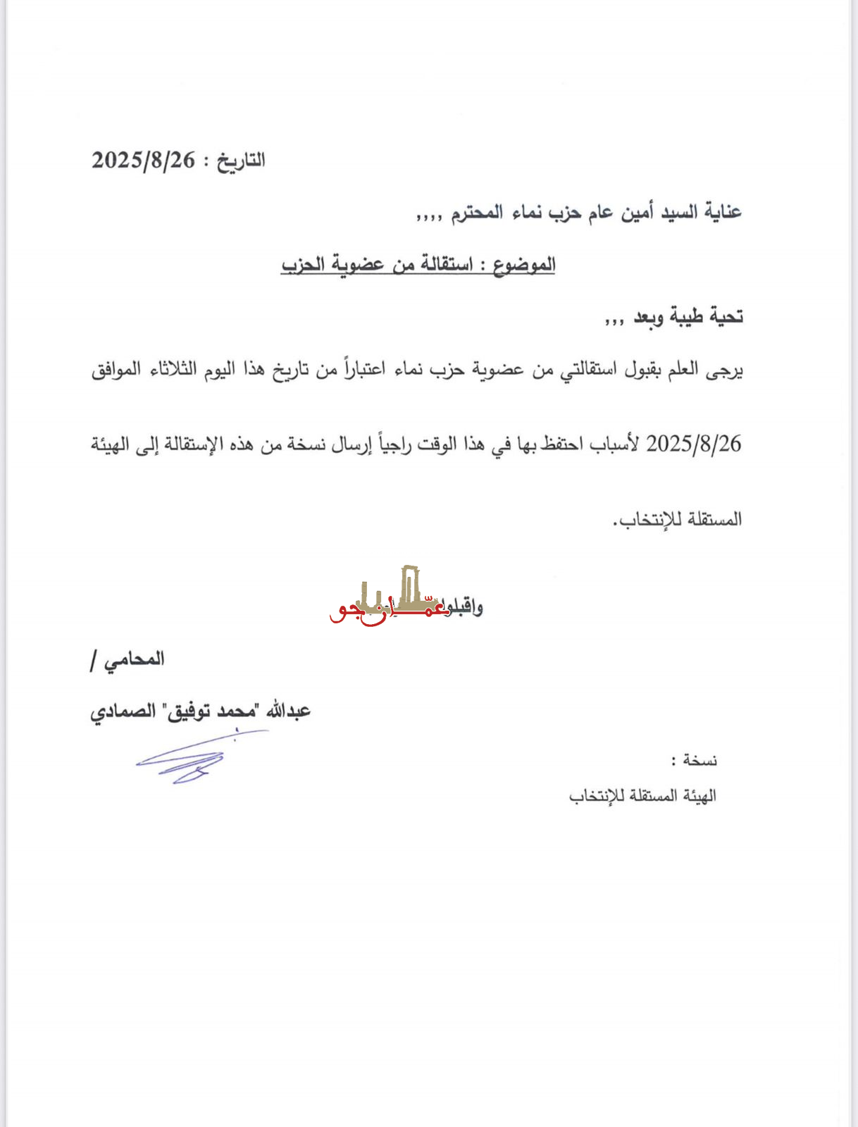 كما طالب بإرسال نسخة من كتاب الاستقالة إلى الهيئة المستقلة للانتخاب.