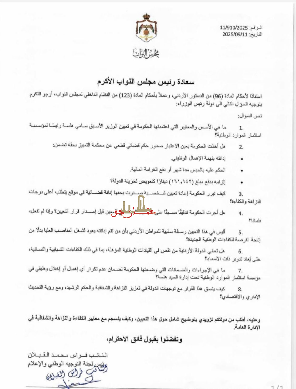 شنّ النائب فراس محمد القبلان، رئيس لجنة التوجيه الوطني والإعلام، هجومًا واسعًا على الحكومة ، بعد أن وجّه مجموعة كبيرة من الأسئلة، وصفها المراقبون بأنها الأكثر جرأة وشمولًا خلال الدورة الحالية، حيث طالت ملفات التعيينات العليا، والتعليم، والطاقة والنفط والغاز.
